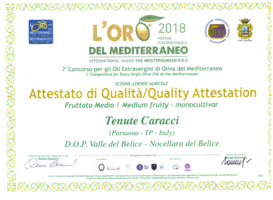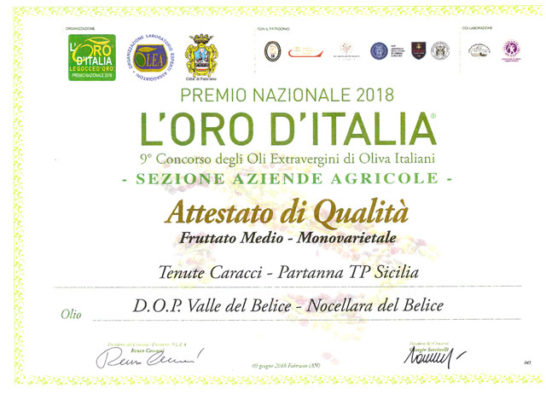 L'olio extravergine di oliva di Tenute Caracci è prodotto a partire dalla cultivar Nocellara del Belice, pianta di ulivo tipica delle valli del trapanese. La sua qualità e unicità sono state insignite del marchio D.O.P., un riconoscimento che attesta a livello europeo la bontà di un prodotto d'eccezione.